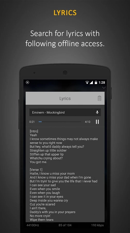 - MUSIXMATCH MUSIC LYRICS: Belkide listemizin en ilginç aynı zamanda en başarılı müzik çaları bu olabilir sevgili okurlar.Çünkü müzik dinlediğiniz zaman aynı anda şarkı sözlerini sizlere gösterip sanki karaoke yapıyormuşsunuz hissiyatını verebiliyor.Aynı zamanda dışarda duyduğunuz bir müziği dinletip o şarkıyı bulabiliyor ve bu sözleri televizyonunuza yansıtıp arkadaşlarınız,aileniz,sevdikleriniz ile çok güzel bir karaoke zamanı geçirmenizi sağlıyor.Kaçırmamanız gereken çok güzel bir uygulamadır.Linkine buradan ulaşabilirsiniz.